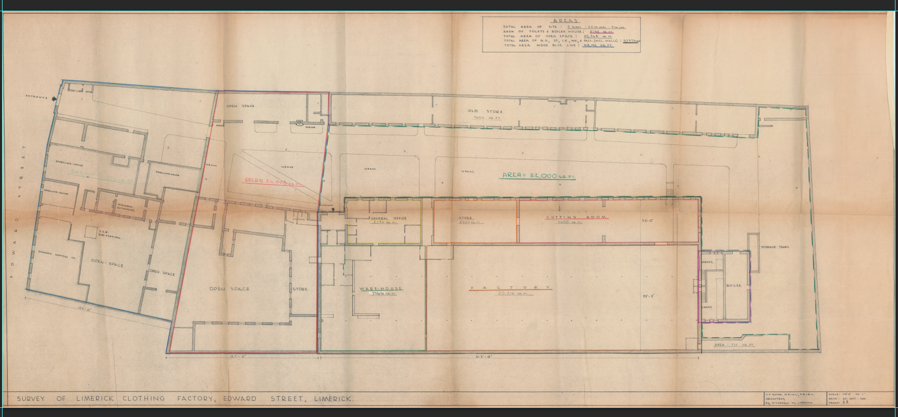 Survey of Limerick Clothing Factory, Lord Edward Street, by C.J. Quinn, Architects, 86 O’ Connell Street, Limerick, Scale 16: 1 Total Area of Site 3 Acres 22 square perches 9 square yards.